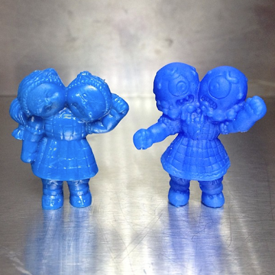 The 1.5" tall edition has been cast in a mix of green, yellow and red flexible rubber. Limited to only 6 copies worldwide and comes with an exclusive 4:20 stereogram 'magic eye' header card. The Critters will be available for $15 each, April 20 at Man-E-Toys.